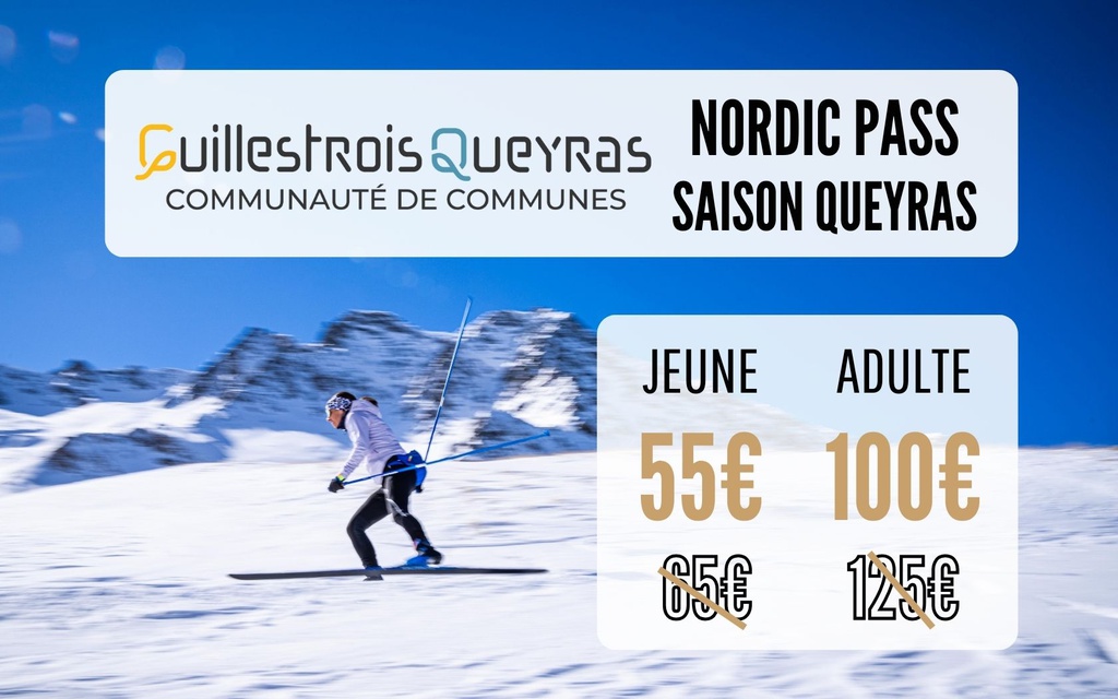 Nordic Pass donnant accès pour toute la saison d'hiver aux pistes de ski de fond et itinéraires nordiques de l'Espace nordique du Queyras, gérés par la Communauté de communes du Guillestrois-Queyras.